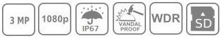 H.264B; объектив: f= 3.6 мм (угол обзора 80°); Чувствительность: 0.003 лк/F1.0(Цвет); Запись: 4МП / 3МП - 25К/с; Функции: видео аналитика (IVS), WDR 120 дБ, 3D-DNR, BLC, день/ночь (ICR); Встроенный микрофон. Интерфейсы: микро SD до 256 Гб; Подсветка 30 м; IP67, DC 12В/8.5 Вт, PoE(802.3af), ф122x99 мм, 480г